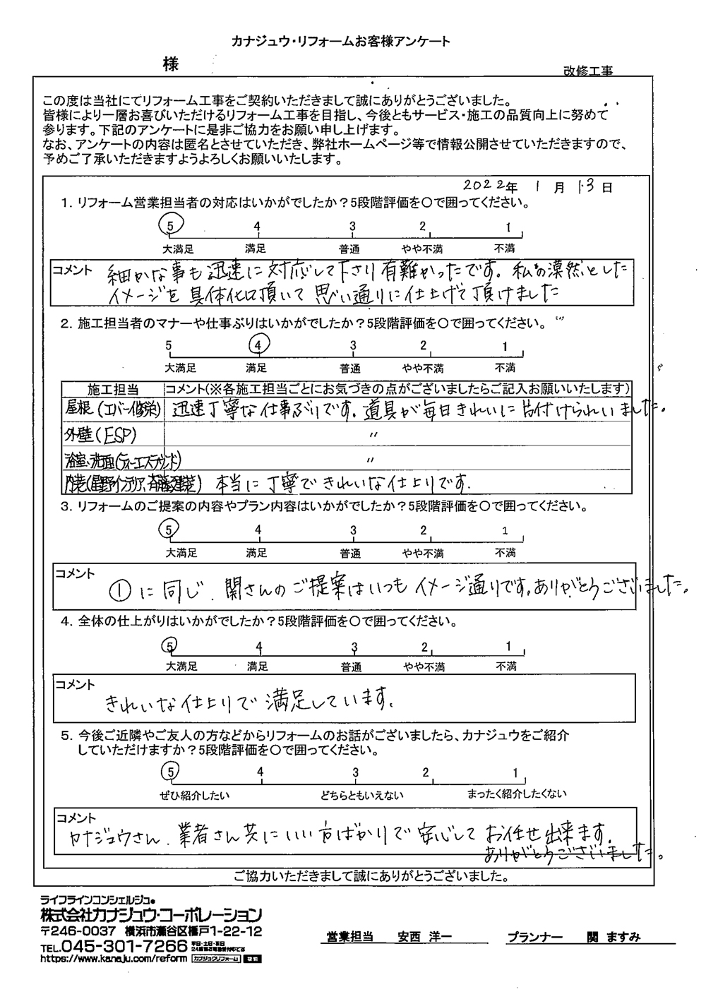 カナジュウでリフォーム・リノベーションをさせていただきました、 お客様から寄せられたアンケートをご紹介いたします。