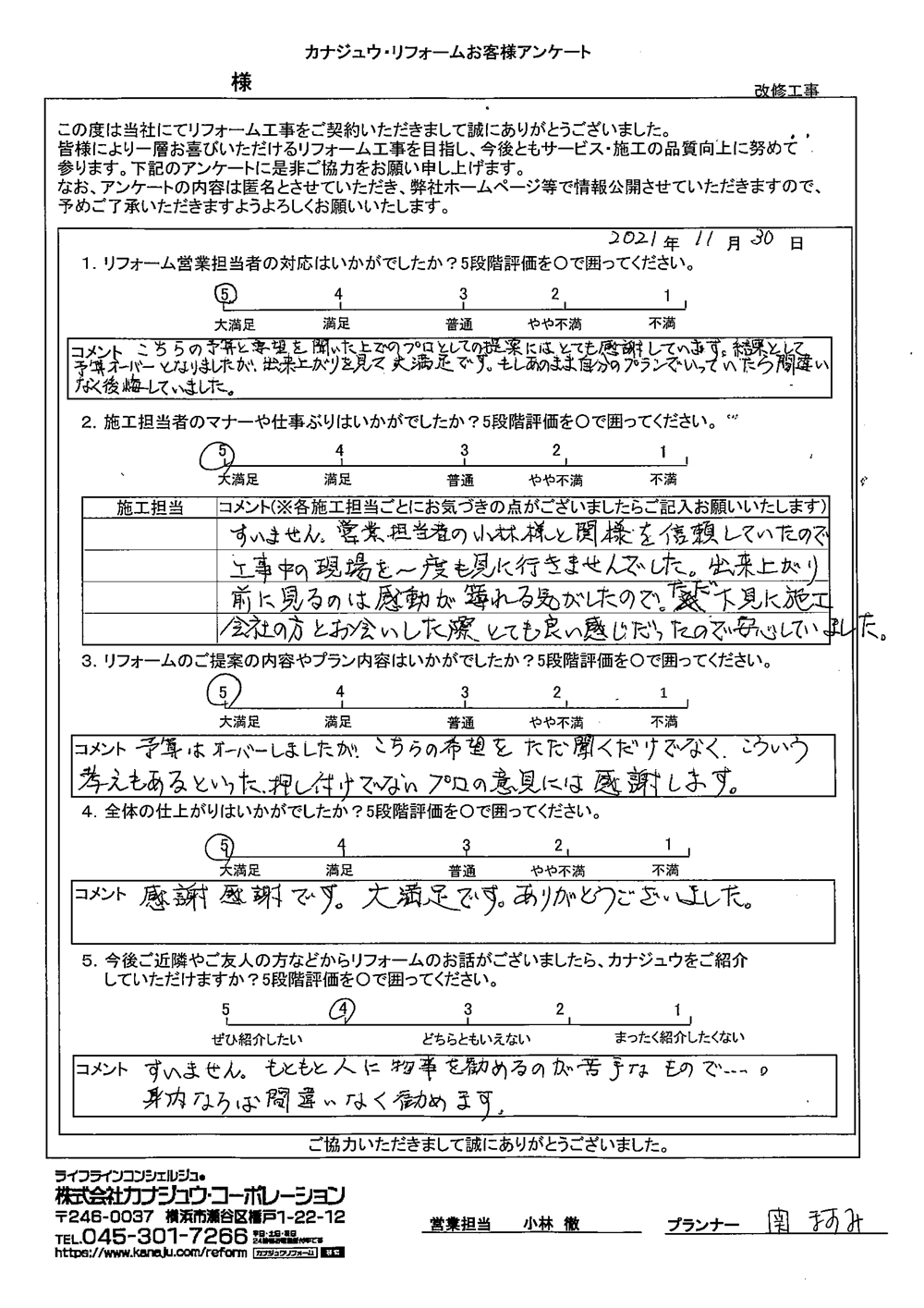 カナジュウでリフォーム・リノベーションをさせていただきました、 お客様から寄せられたアンケートをご紹介いたします。