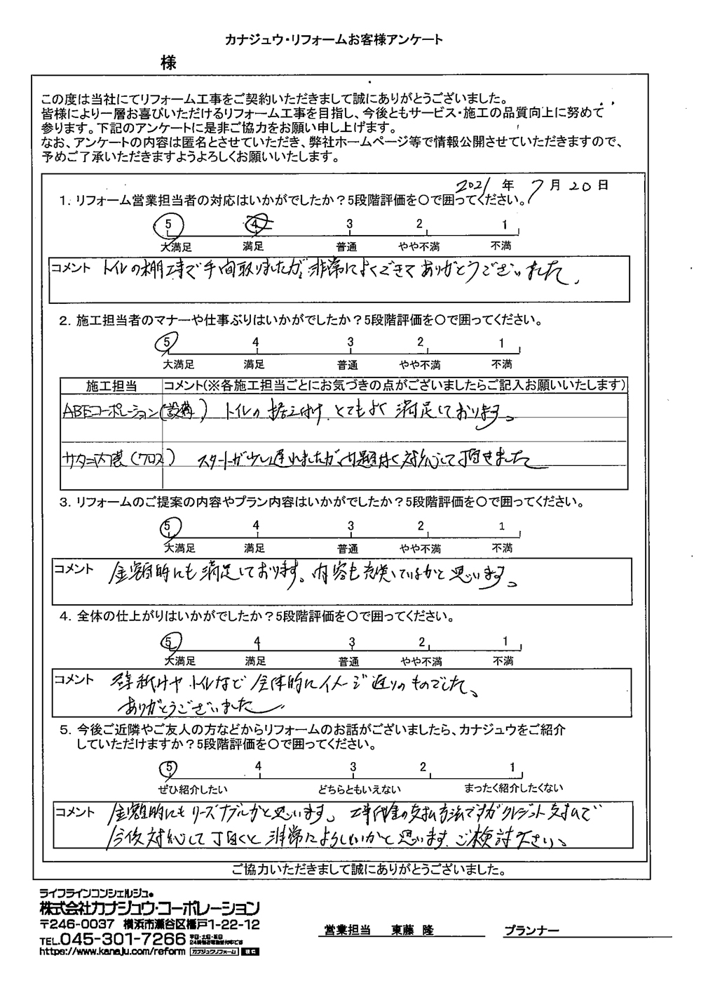 カナジュウでリフォーム・リノベーションをさせていただきました、 お客様から寄せられたアンケートをご紹介いたします。
