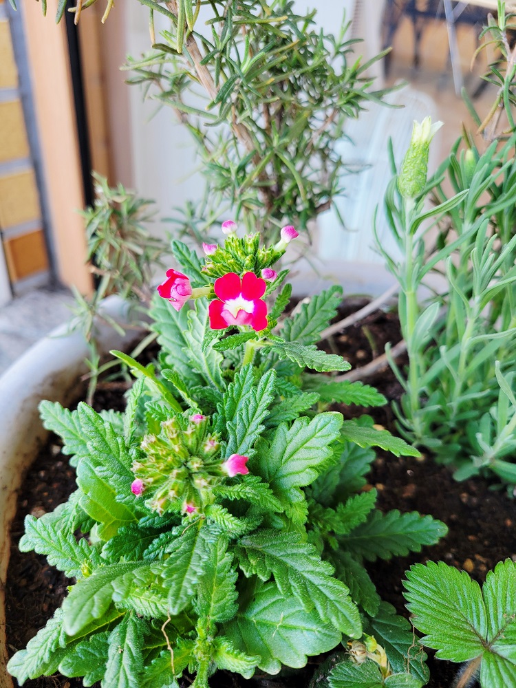 春らしい雰囲気になるように、ハーブやお花を組み合わせた寄せ植えにしています。