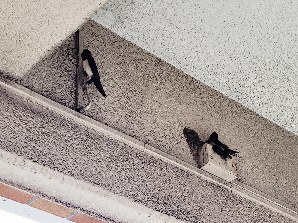 先日、出勤時に近くで鳥の鳴き声が聞こえたため、ふと上を見上げてみると、つばめの夫婦が巣作りを始めていました。