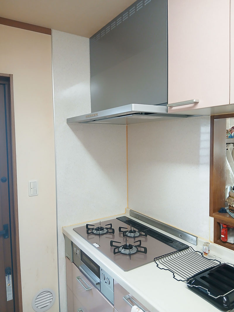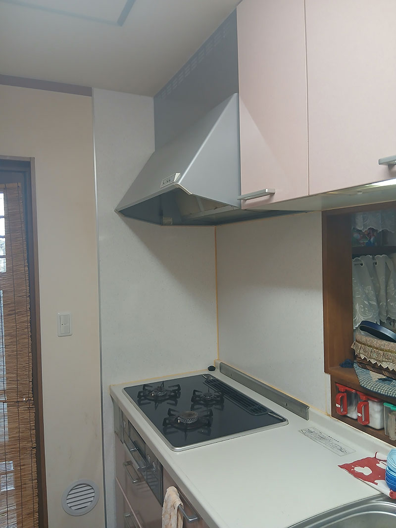 20年近くお使いで経年劣化したレンジフードの交換をお考えのお客様です。「シロッコファンを外してお掃除するタイプは、お手入れが大変そう…」とのことで、オイルスマッシャーを搭載し10年間ファンのお手入れ不要なリンナイOGRシリーズをご提案。同時にガスコンロの交換もご依頼いただきました。