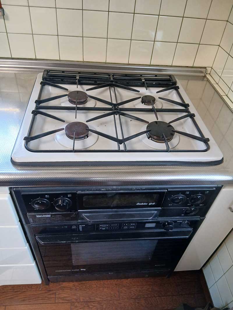 ガスオーブン、レンジフードと併せてビルトインガスコンロの交換もご依頼いただきました。いままでお使いのガスコンロと点火部分が同じとのことでリンナイのリッセをご案内。リッセでお湯沸かし体験やタイマー機能、ココットプレートでの下面の焼き色を確認するためにトースト調理体験し、ご試食いただきました。グリルの大きさ、高級感、スムーズなレール、お手入れ性能が決め手となりリンナイのリッセ幅60cm、天板色はクラシックミラーをお選びになりました。