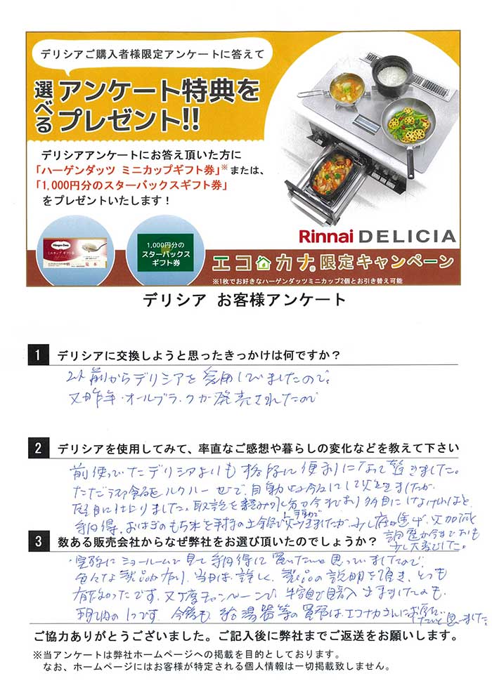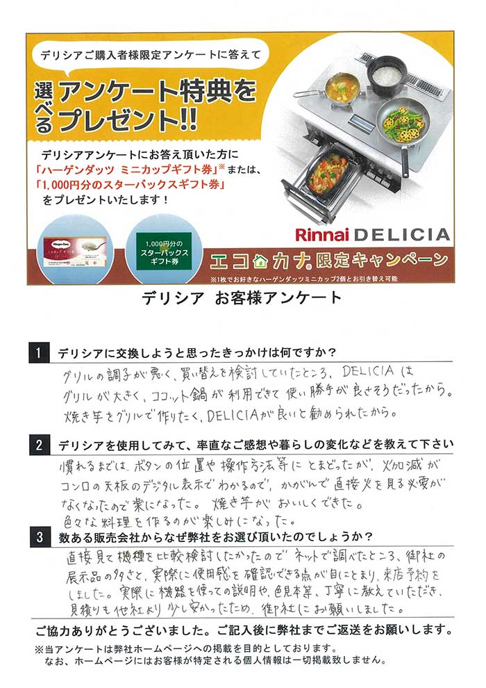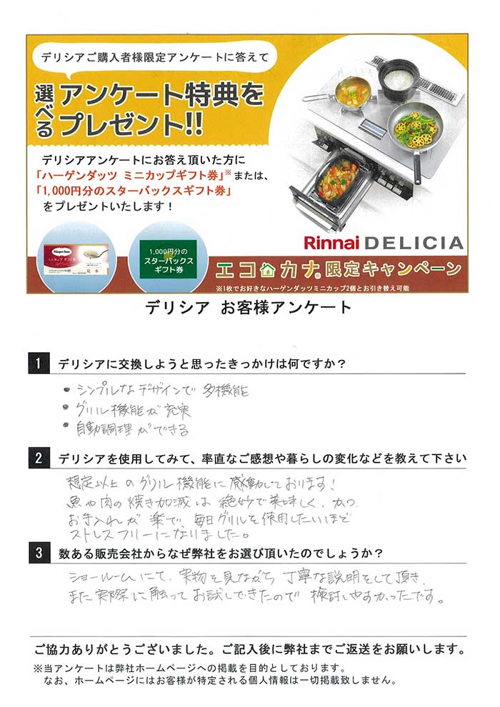 エコカナでリンナイのビルトインコンロDELICIA(デリシア)をご購入されて、