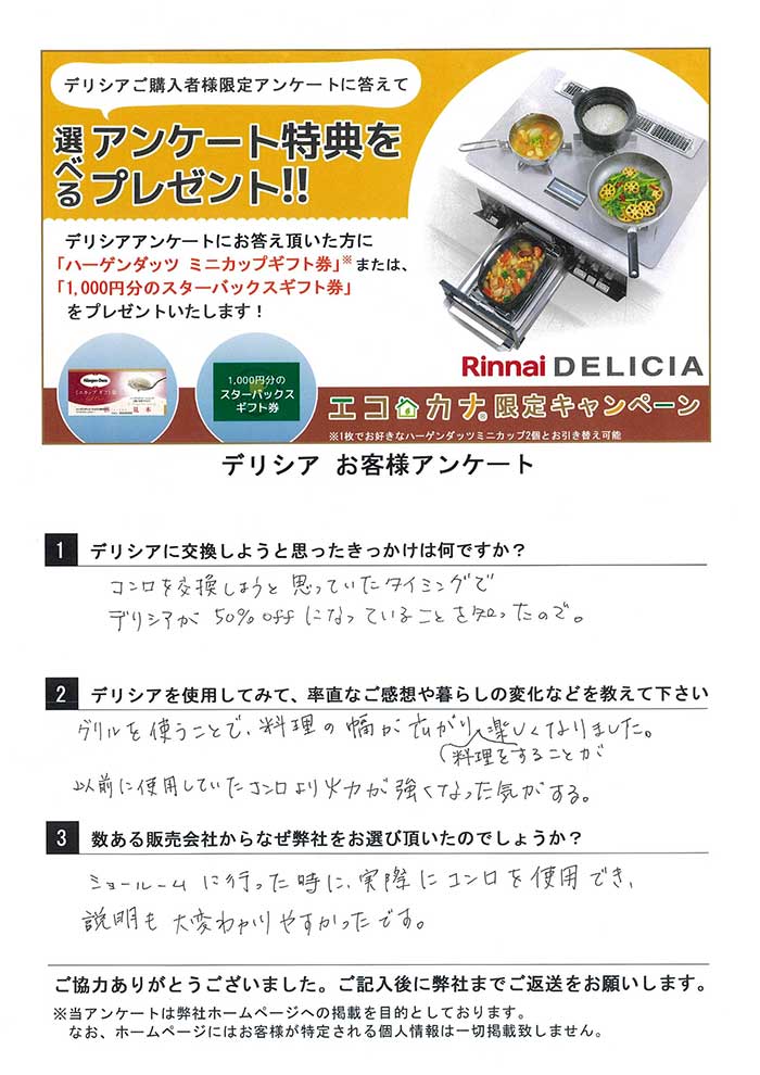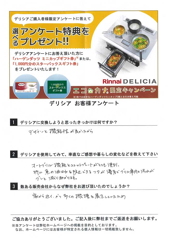 - 15年使用していたガスコンロがだめになって、ショールームでみてRinnaiのガスコンロが料理をよくする私にとって適切だと思い近所に住む友人もRinnaiのデリシアにされたばかりでしたので、使ってみたいと思いました。