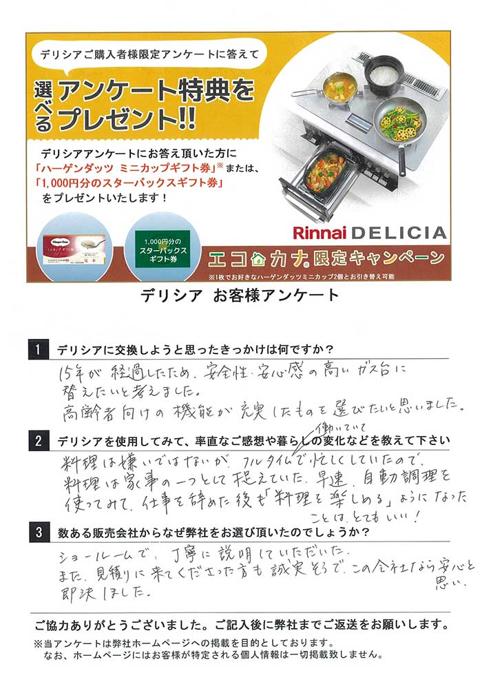 - 15年が経過したため、安全性・安心感の高いガス台に替えたいと考えました。高齢者向けの機能が充実したものを選びたいと思いました。