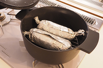 ④ アルミ箔で包んで両端をねじったら、内網と加熱用の水(250ml)を入れたレジェロに並べます。
