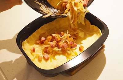 ⑧ 先ほど炒めた玉ねぎとベーコンを入れてからキッシュ液を流し込みます。