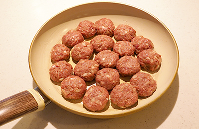⑤ 肉だねを20等分にして軽く平にして丸めたら、サラダ油(小さじ1)を入れたフライパンに並べます。