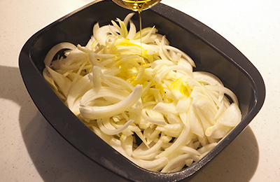 ④ ザ・ココットに薄切りにしたたまねぎを入れ、塩ひとつまみ(分量外)をふって全体を混ぜます。その上からオリーブオイル(大さじ1)をかけて、さらに混ぜます。