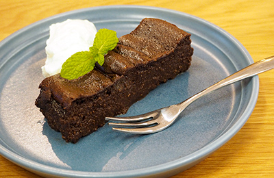 バターは使わず、豆腐をメインに使っているので甘さ控えめのあっさりヘルシーな仕上がりに。口当たりも通常のガトーショコラよりしっとりとしています。