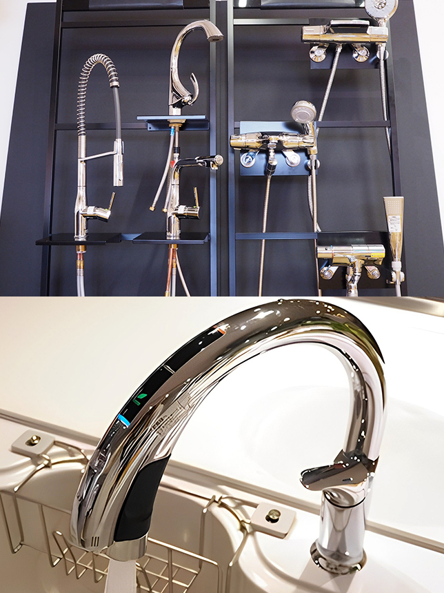 TOTO、リクシル、SANEI、グローエ、KVK、タカギのキッチン水栓を展示しております。エコカナのキッチンで実際に使用しているタッチレス水栓や、ウルトラファインバブル内臓水栓の体験をしていただけます。