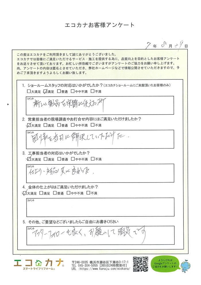 ショールーム見学から施行まで数ヶ月も費やしてしまいましたが対応して下さり助かりました。