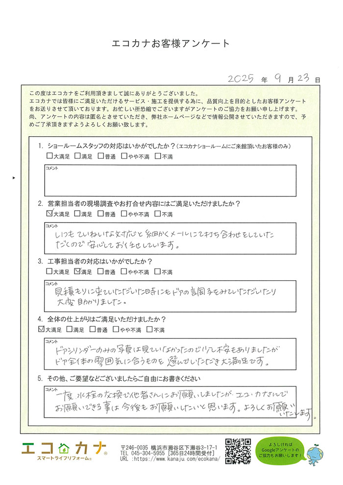 一度、水栓の交換で他者さんにお願いしましたが、エコカナさんでお願いできる事は今後もお願いしたいと思います。よろしくお願いいたします。