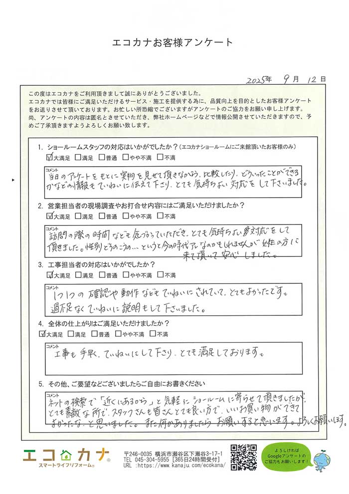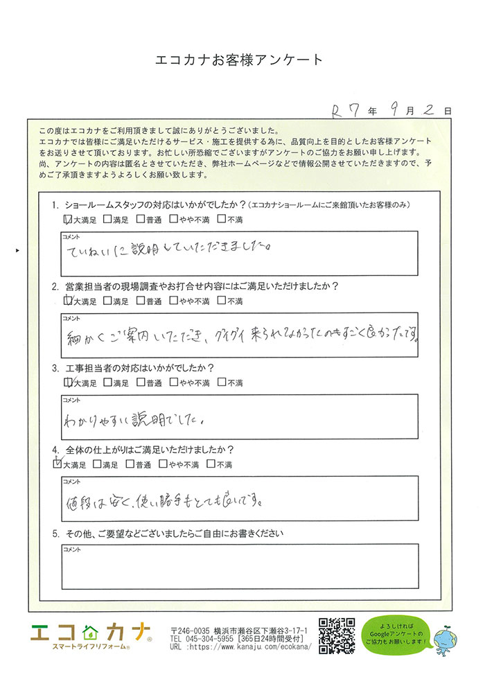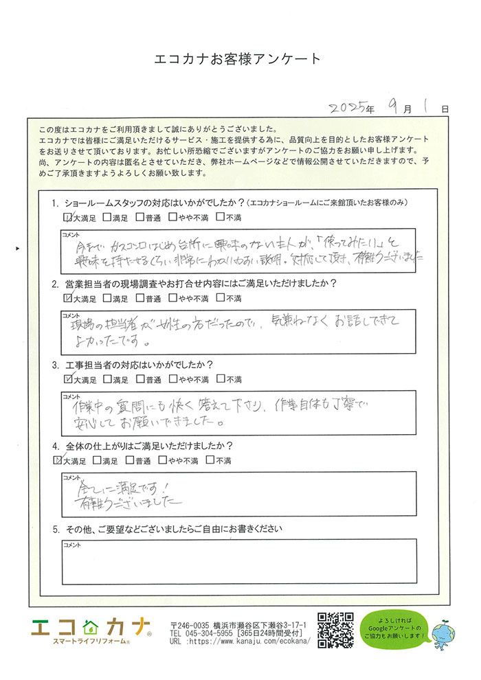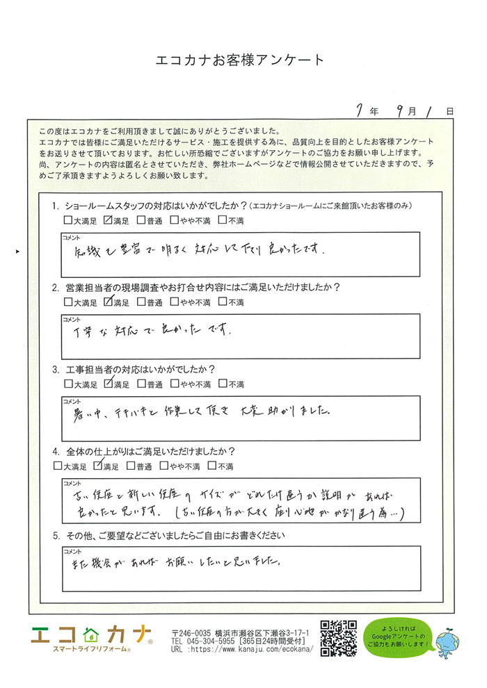 しっかりとした対応と業務のすすめ方に感激致しました。いろいろリフォームも今後考えておりますので、今後も宜しくお願い致します。