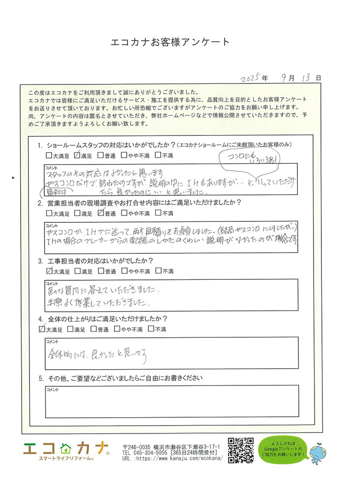 今までガスコンロはじめ台所に興味のない主人が「使ってみたい」と興味を持たせるくらい非常にわかりやすい説明。対応して頂き有難うございました。