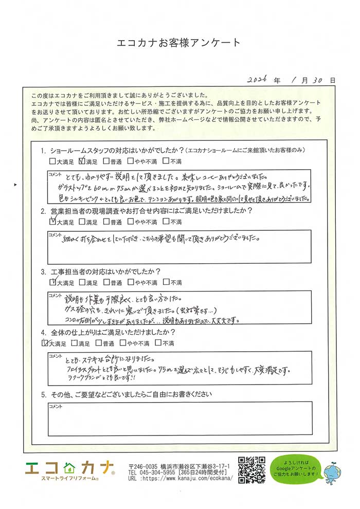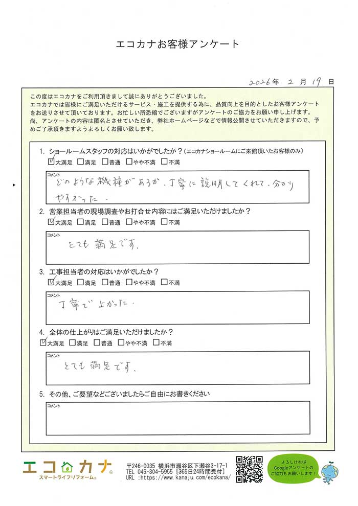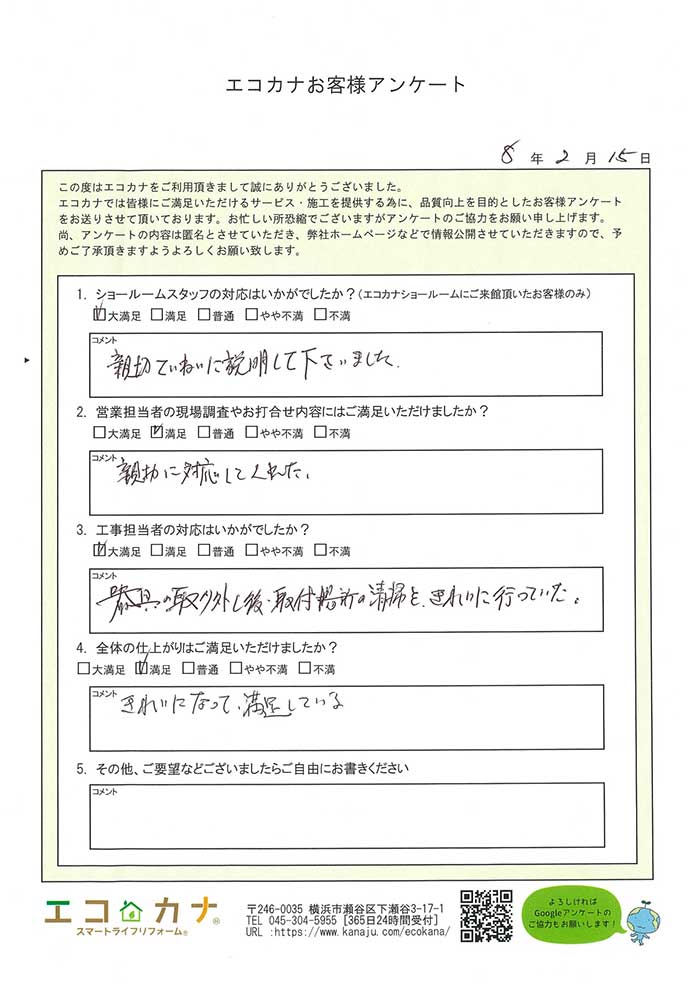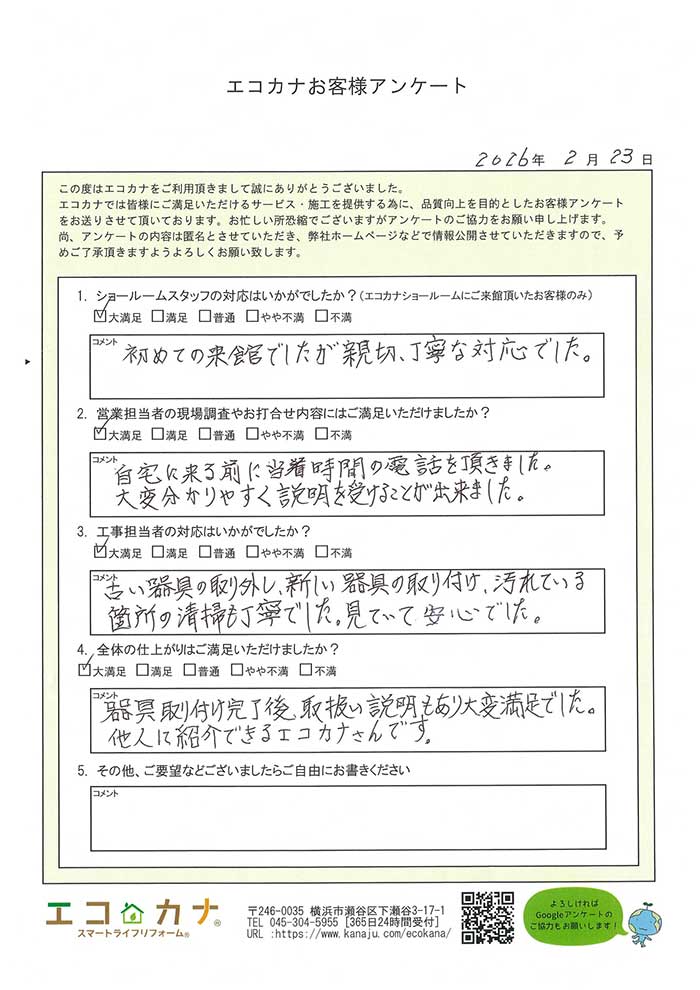 器具取り付け完了後、取扱い説明もあり大変満足でした。他人に紹介できるエコカナさんです。