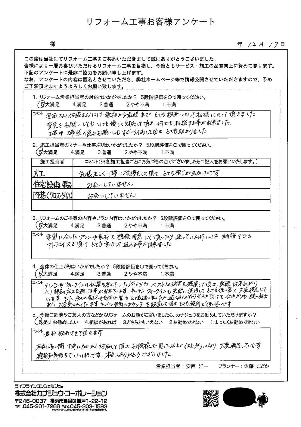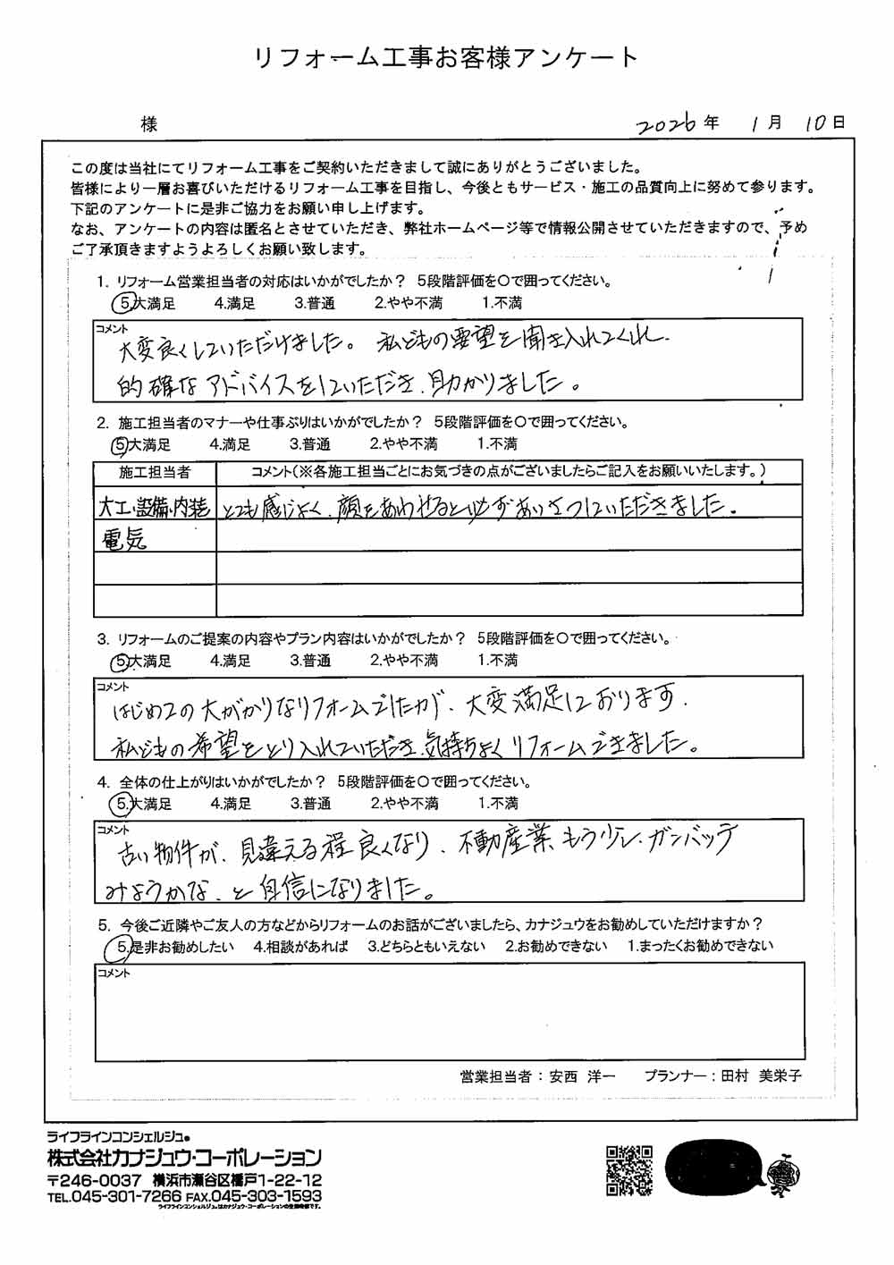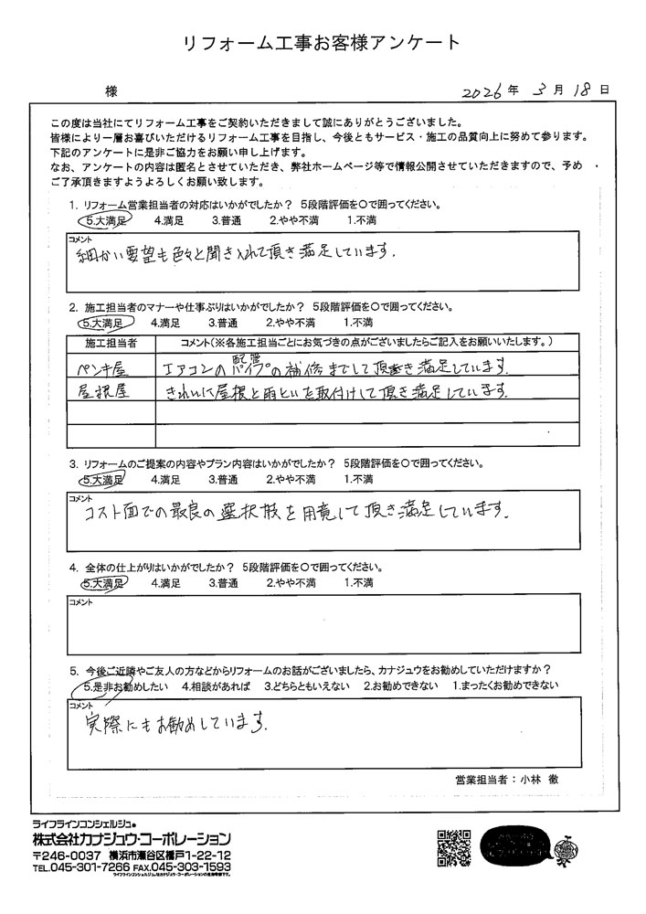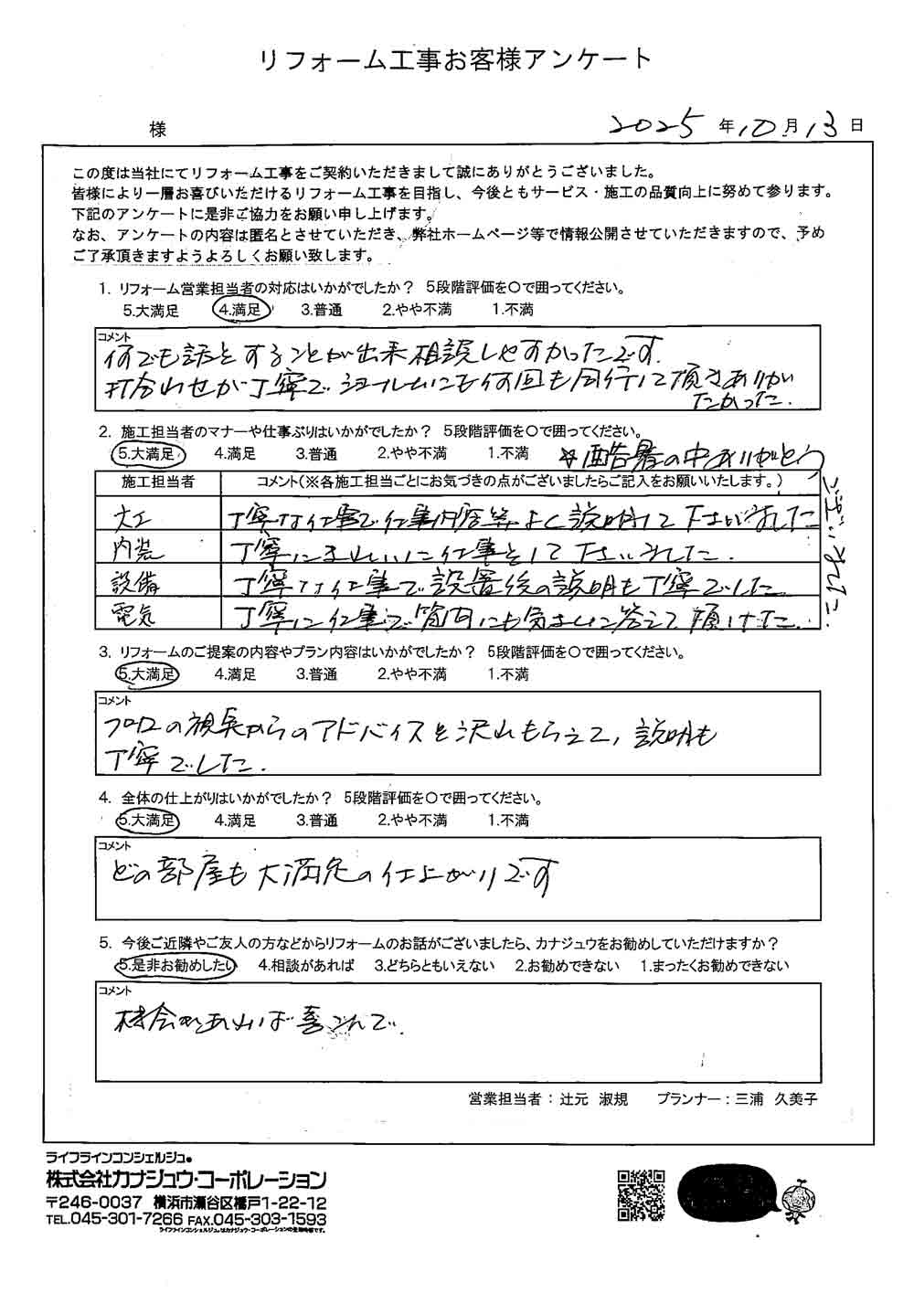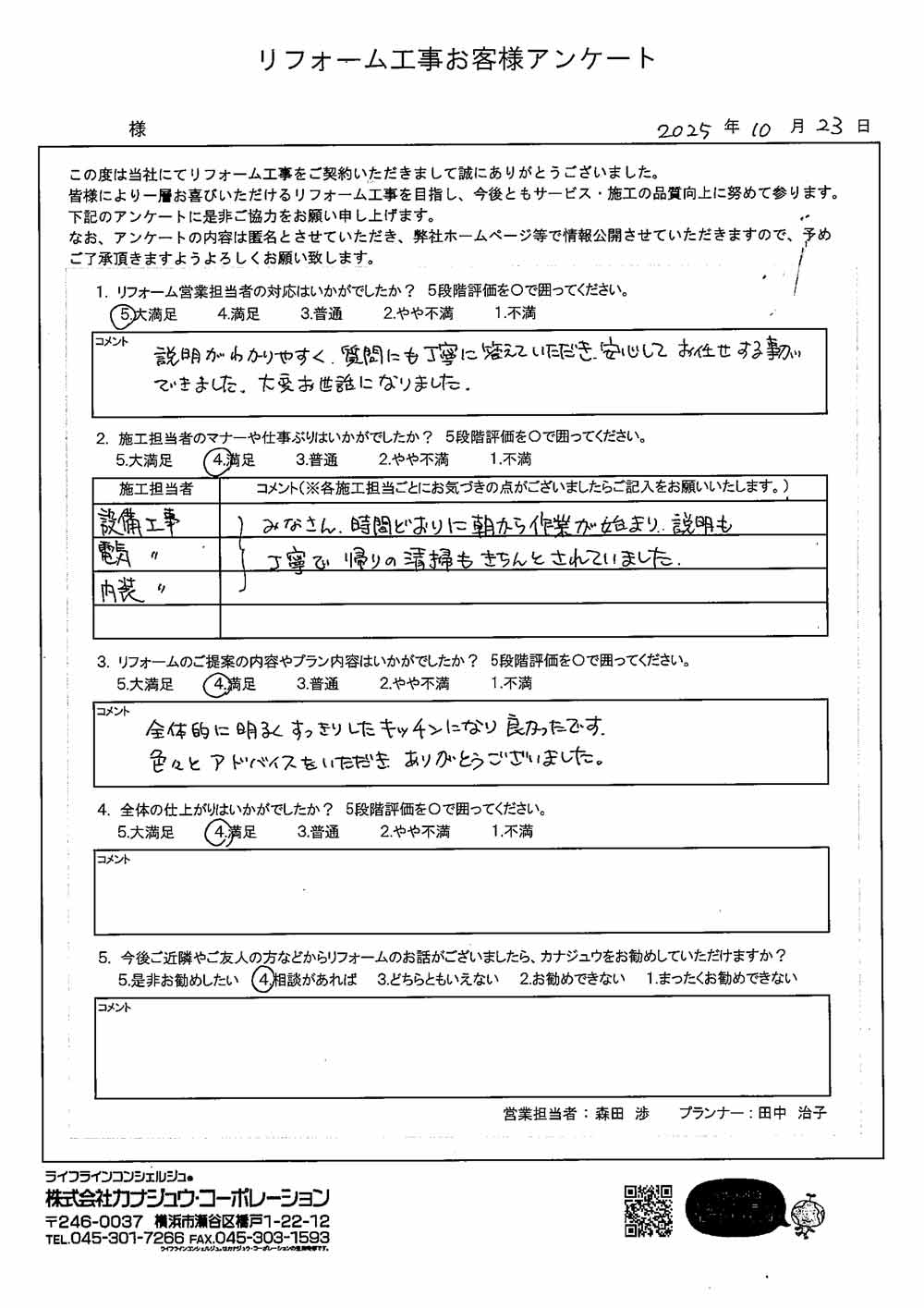 カナジュウでリフォーム・リノベーションをさせていただきました、 お客様から寄せられたアンケートをご紹介いたします。