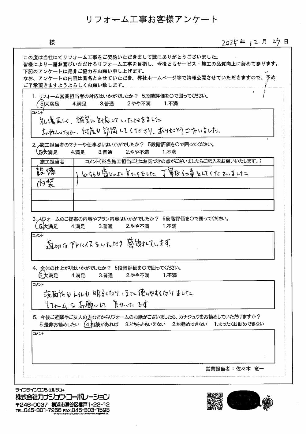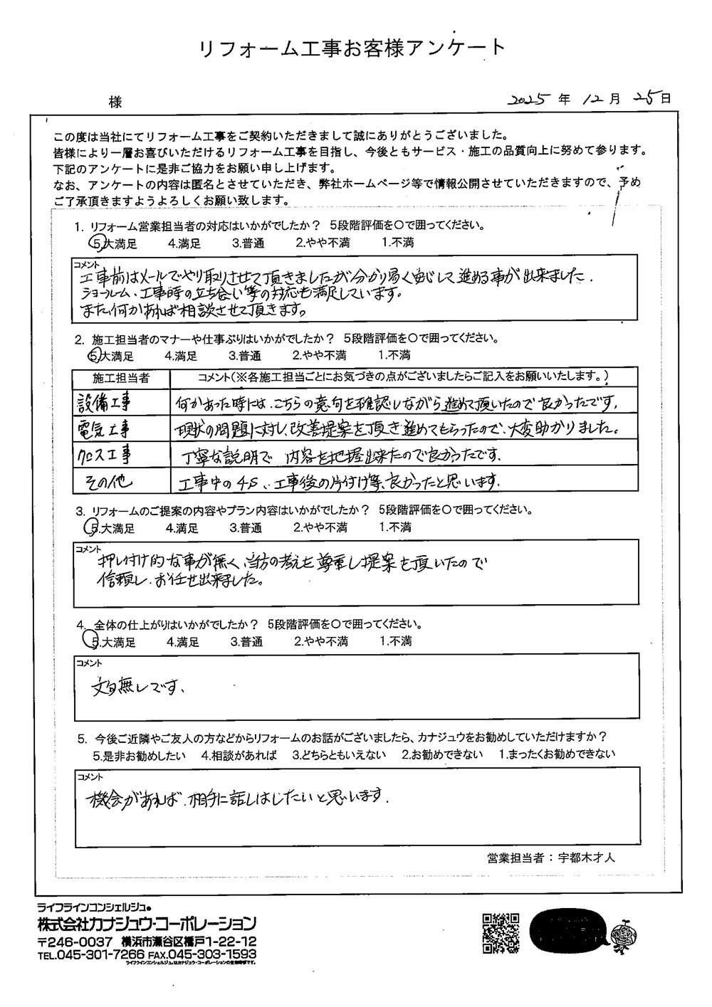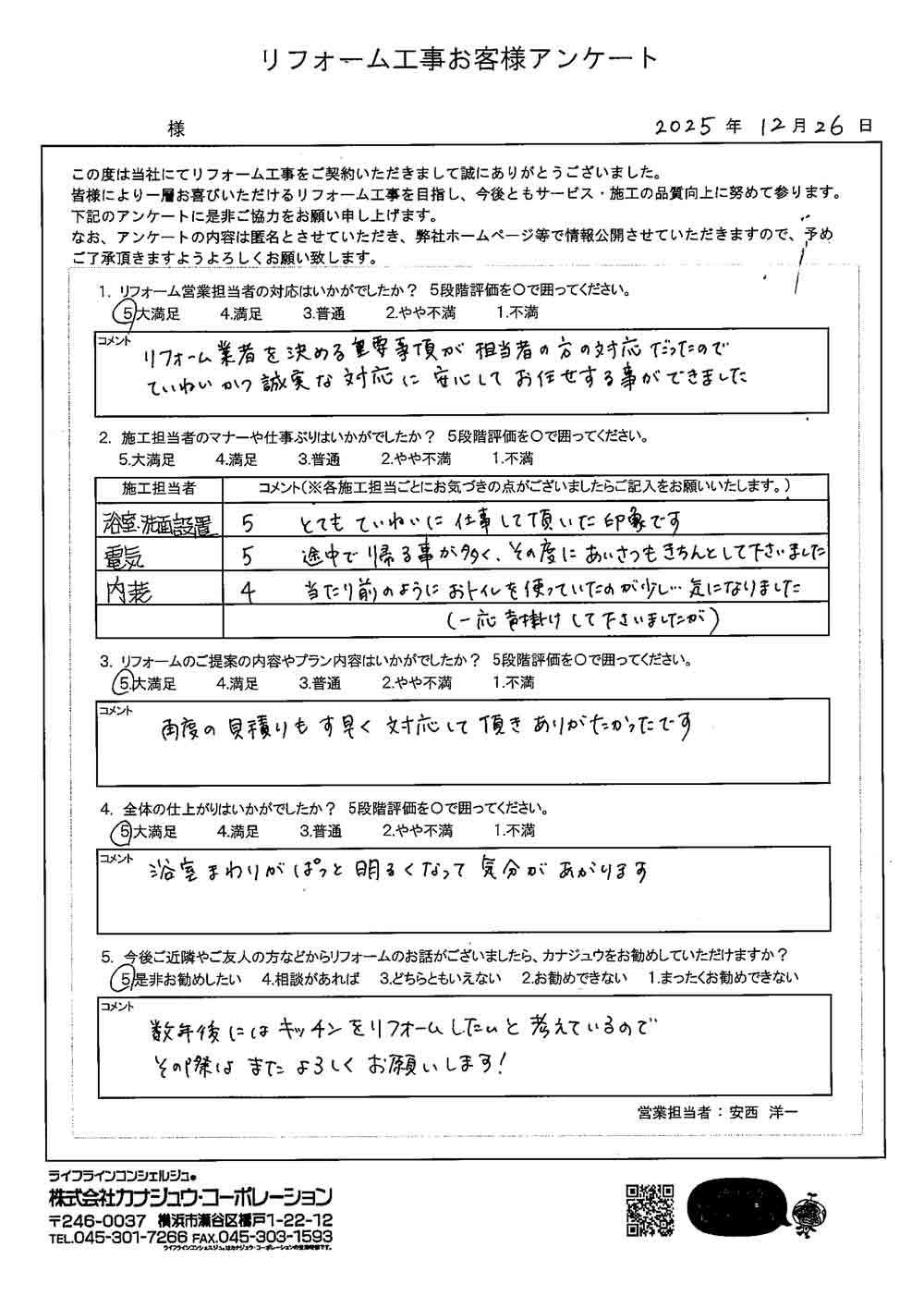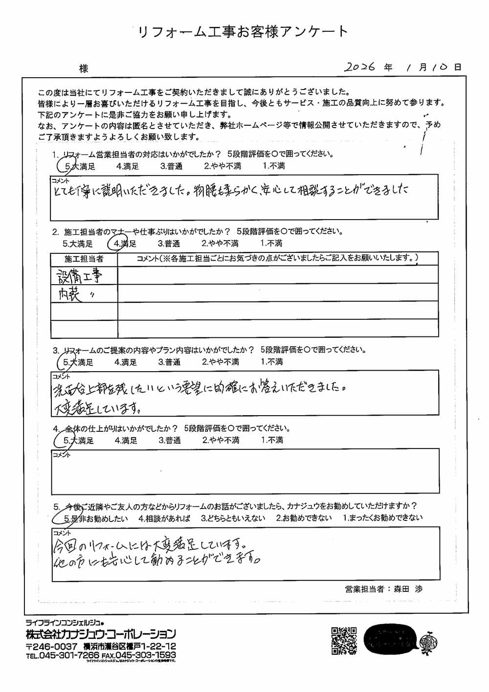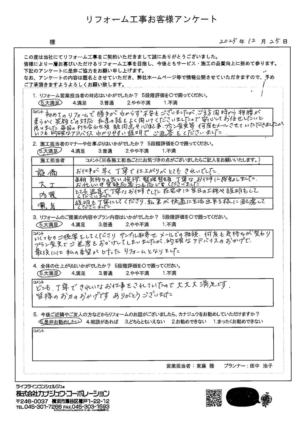 カナジュウでリフォーム・リノベーションをさせていただきました、 お客様から寄せられたアンケートをご紹介いたします。
