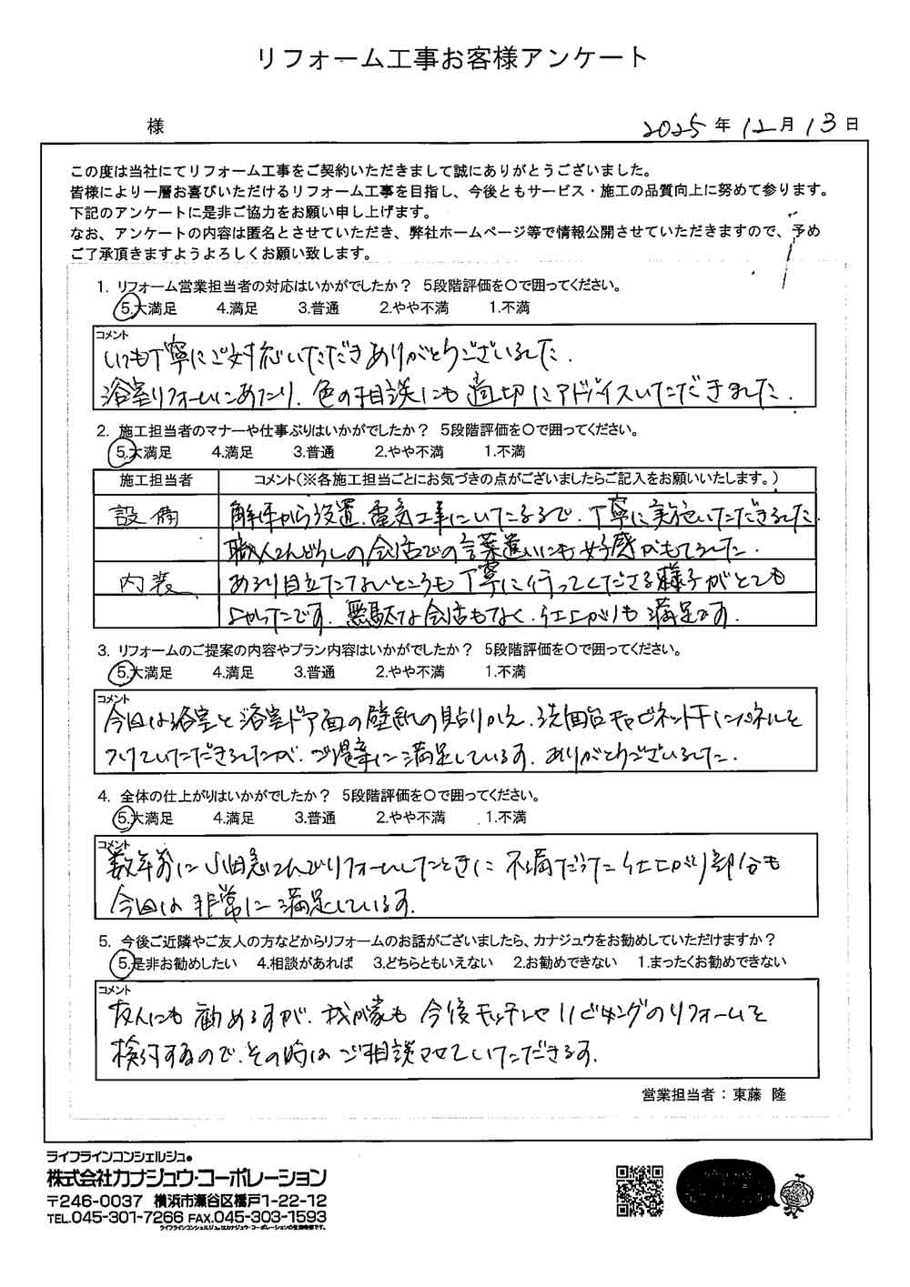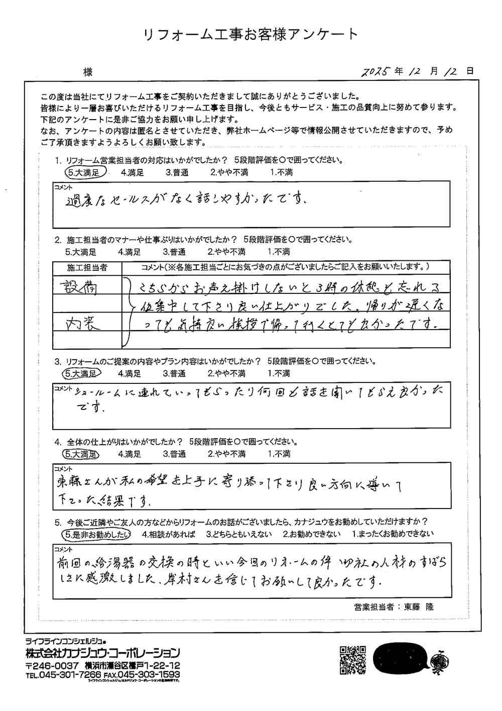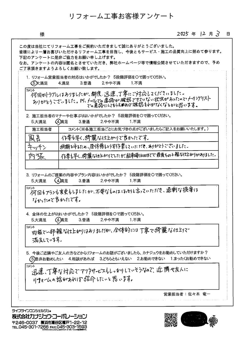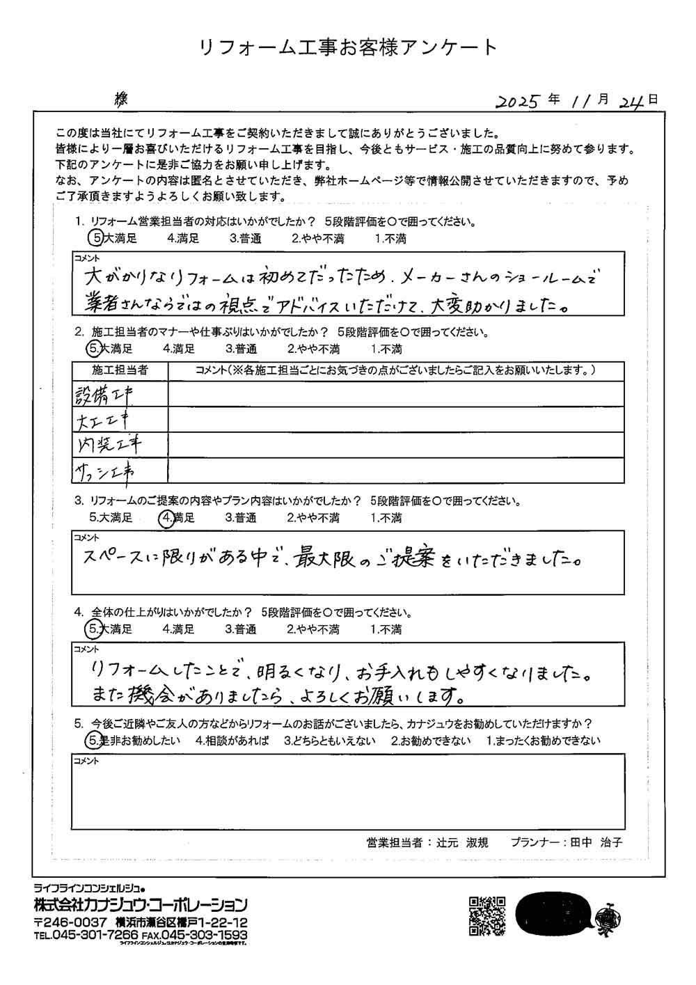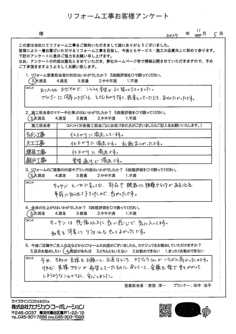 カナジュウでリフォーム・リノベーションをさせていただきました、 お客様から寄せられたアンケートをご紹介いたします。