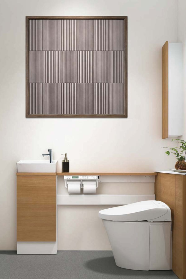 濃い色の木目調はスタイリッシュな印象になります。背面のエコカラットプラスの「グラナスヴァーグ」のホワイト色で壁面にリズムが生まれ、無垢テイストのフローリングを合わせるとかっこいいトイレ空間になります。