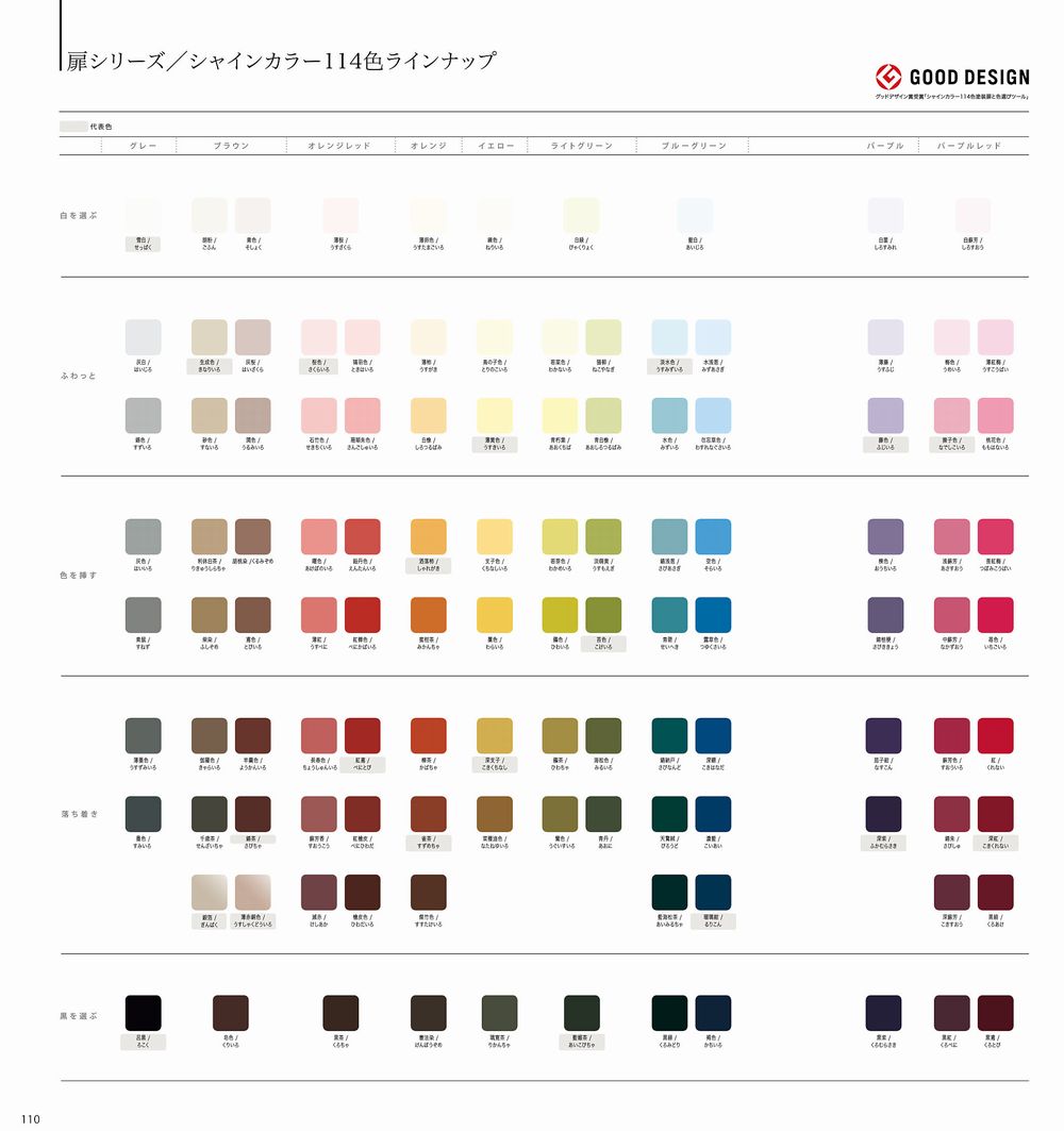 ベリーの扉シリーズ「シャインカラー」はなんと、114色。いずれも日本の伝統色、その一色一色に素敵な和名がつけられていて、ショールームで一目惚れをされるお客様も多いのです。