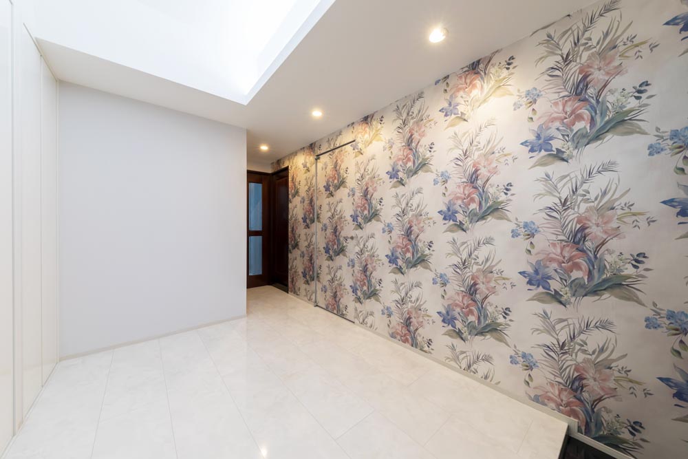 住まいを開放的で明るいイメージにしたいというご要望を叶えるため、女性プランナーから玄関横の洋室を無くし広々としたホールをつくるご提案をしました。玄関を開けると自転車も置けるマンションとは思えない開放感のある空間。広々とした空間を有効活用し、壁面にデスクスペースやクローゼットを設置しました。玄関からリビングまでの壁面には、ご主人がお選びになったエレガントな花柄の輸入クロスが印象的。折り上げ天井をコーブ照明が優しく照らす、ホテルライクな空間が出迎えてくれます。