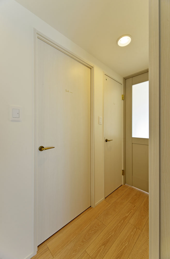 洋室は内装を一新しました。フローリングはLDKと同じオーク柄エクリュに張り替え、クロスは天井まで全てニュアンスカラーのグレージュでまとめました。ぬくもりと落ち着きのあるリラックスできる空間となりました。