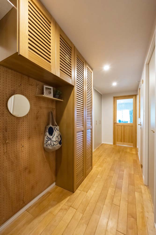 広い廊下を活かし、ウッドワンの玄関収納を新しく設置。ルーバー扉は奥様がお選びになり、デザイン性と通気性を両立しながら、海外テイストなおしゃれな空間を演出してくれます。ご主人がDIYでつけた有孔ボードは、廊下の壁面を見せる収納として有効活用。小さなお子様がいてもゆとりをもって身支度ができるようになりました。