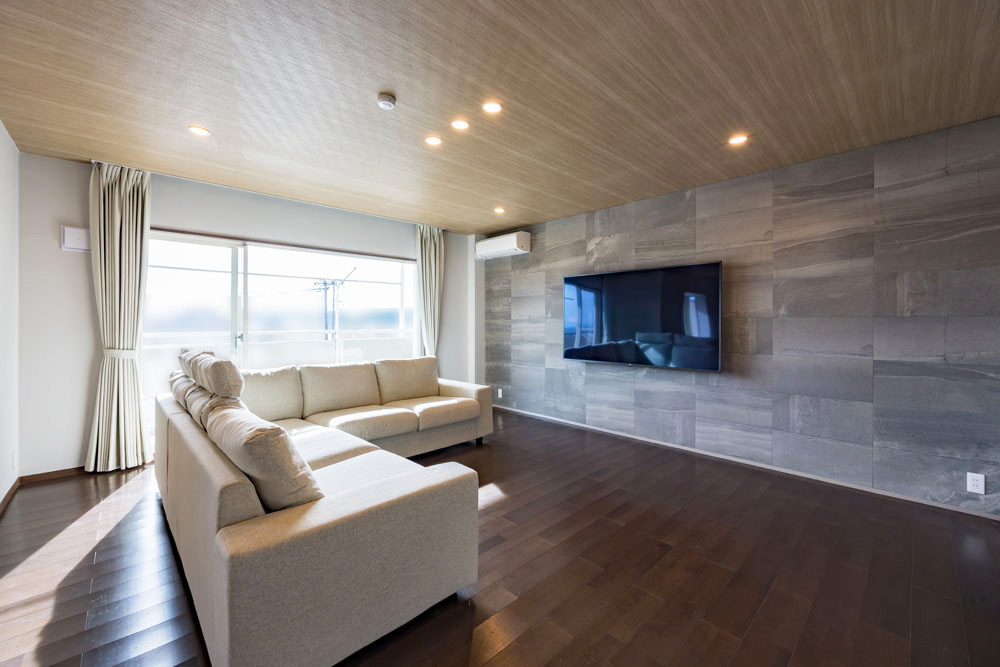 当初は水まわりのみの予定でしたが、「テレビを壁掛けにしたい」というお話をきっかけに、リビングまでリフォーム範囲を広げることに。壁面には天然石の質感を再現したエコカラット「ストーングレース」を採用し、照明はダウンライトですっきりと演出。まるでホテルのラウンジのような上質な空間に仕上がりました。