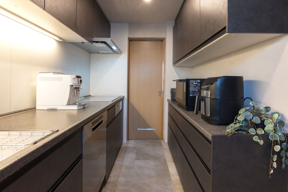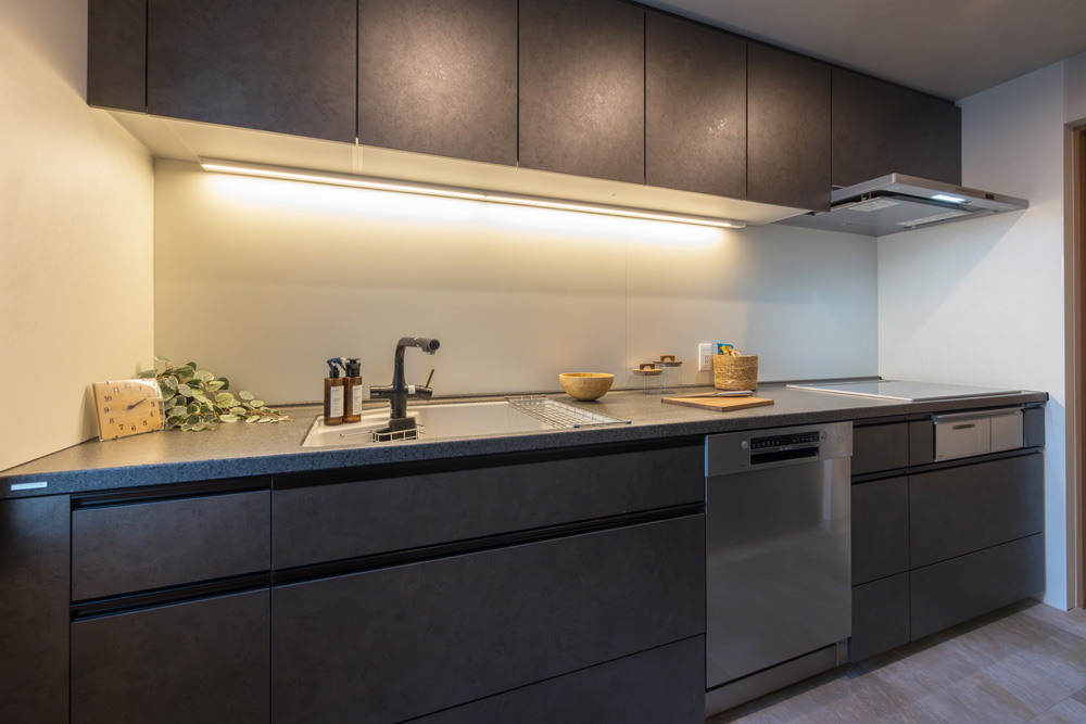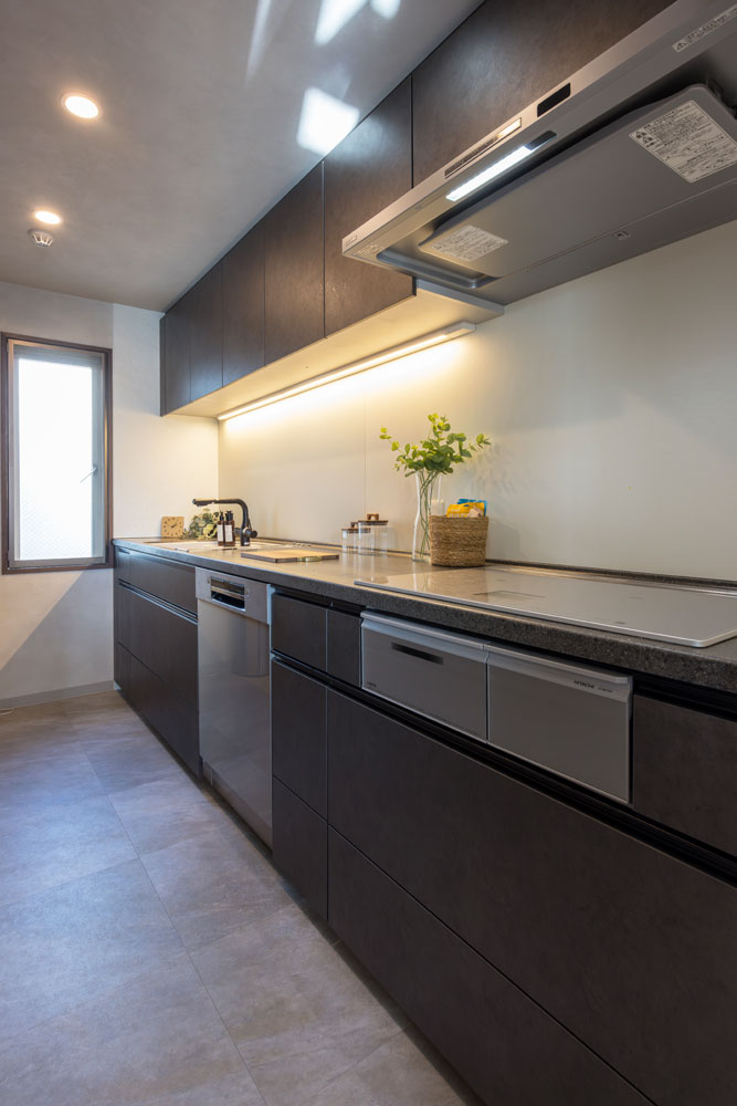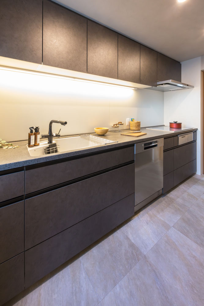 扉カラーはグレイッシュな「メタリックスタッコ」、カウンターには「ハイグラーナブラック」をセレクト。モダンでスタイリッシュな印象の中に、上品な輝きを感じられるキッチンに仕上がりました。