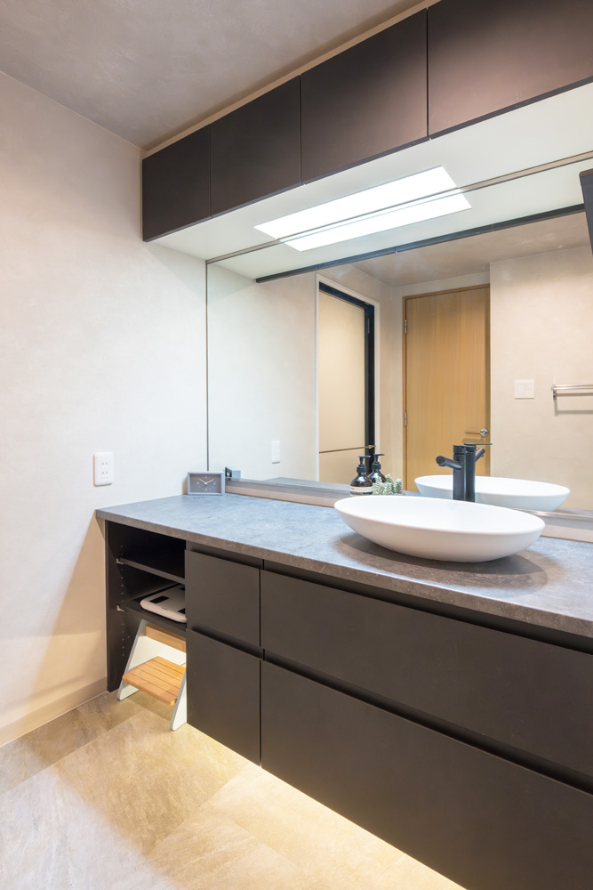 造作のような佇まいに仕上げた洗面化粧台には、アイカ工業の「スマートサニタリー」を採用。ブラックの扉にグレーの天板、ホワイトのオンボウルが映えるデザインで、シンプルながらもやわらかさを感じさせる空間に仕上がりました。収納は開き戸から引き出しタイプへ変更し、使い勝手と収納力を向上。既存の吊り戸棚は活かしながら、扉のみをブラックに変更することで、空間全体に統一感を持たせています。