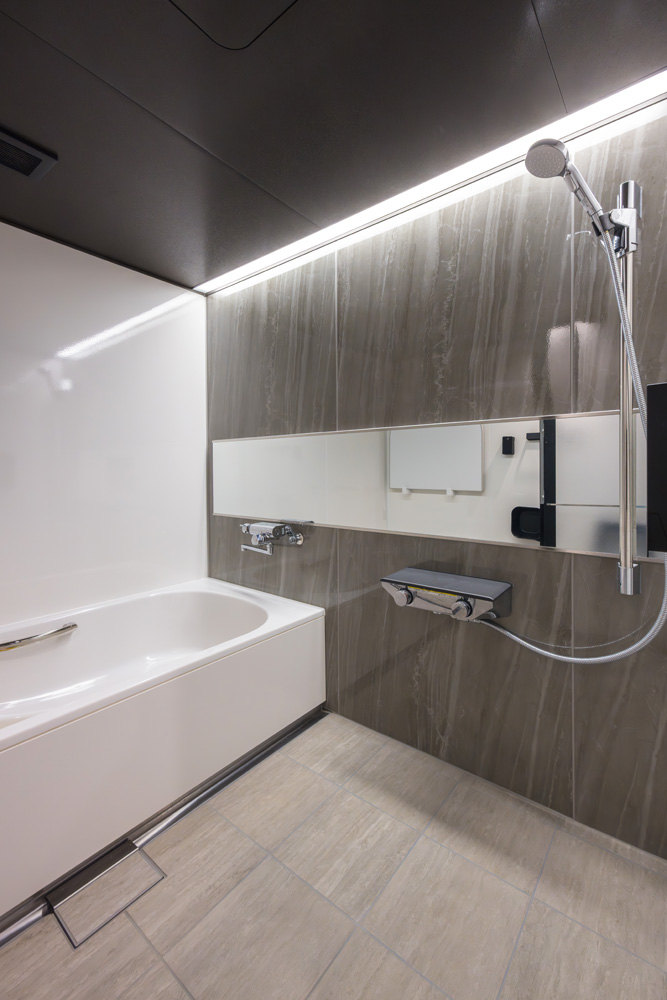 浴室には、タカラスタンダードの「グランスパ」を採用。既存の広さをそのまま活かせる「ぴったりサイズシステムバス」により、ゆとりある空間を実現しました。モスグレーのアクセントパネルに、ブラックの天井やドア枠、ライン照明を組み合わせ、シンプルながらも上質で特別感のある仕上がりに。