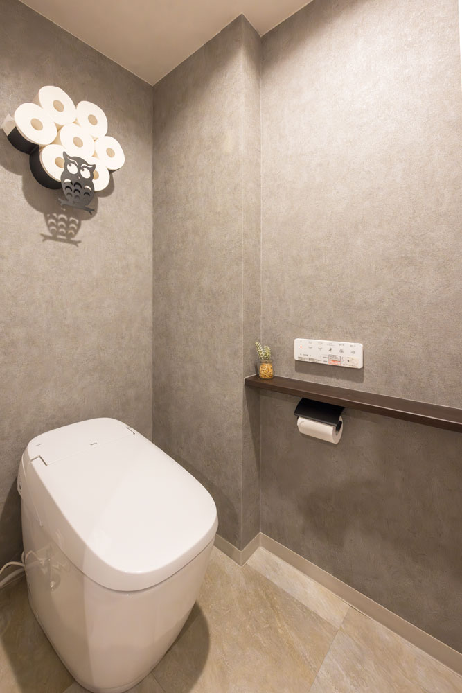 もうひとつのトイレには、LIXILの「サティスGタイプリトイレ」を採用。充実したキレイ機能に加え、プラズマクラスターイオンによる除菌・消臭機能を備え、清潔感あふれる空間を保ちます。グレーのクロスで落ち着いた印象にまとめつつ、ふくろうモチーフのペーパーホルダーがさりげないアクセントに。ほっと心が和む、やさしい雰囲気のトイレに仕上がりました。