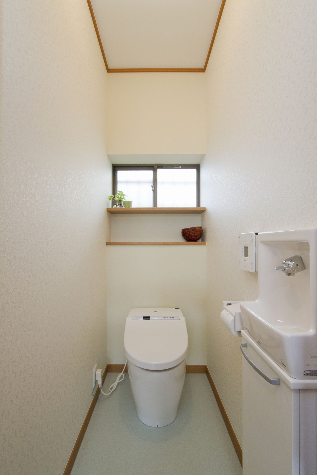 便器をタンクレスにして手洗い器を壁につけました。広くてスタイリシュなトイレ空間になりました。