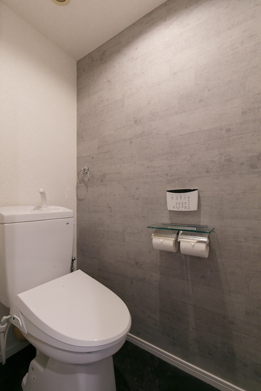 ジャニス工業のトイレにグレーの石目調のタイルを合わせ、ガラス棚(KAWAJUN)を添えて。H様らしいカッコイイ、個性的な空間です。トイレ空間は狭いながらもクロスで個性を出しながら遊べる場所です。