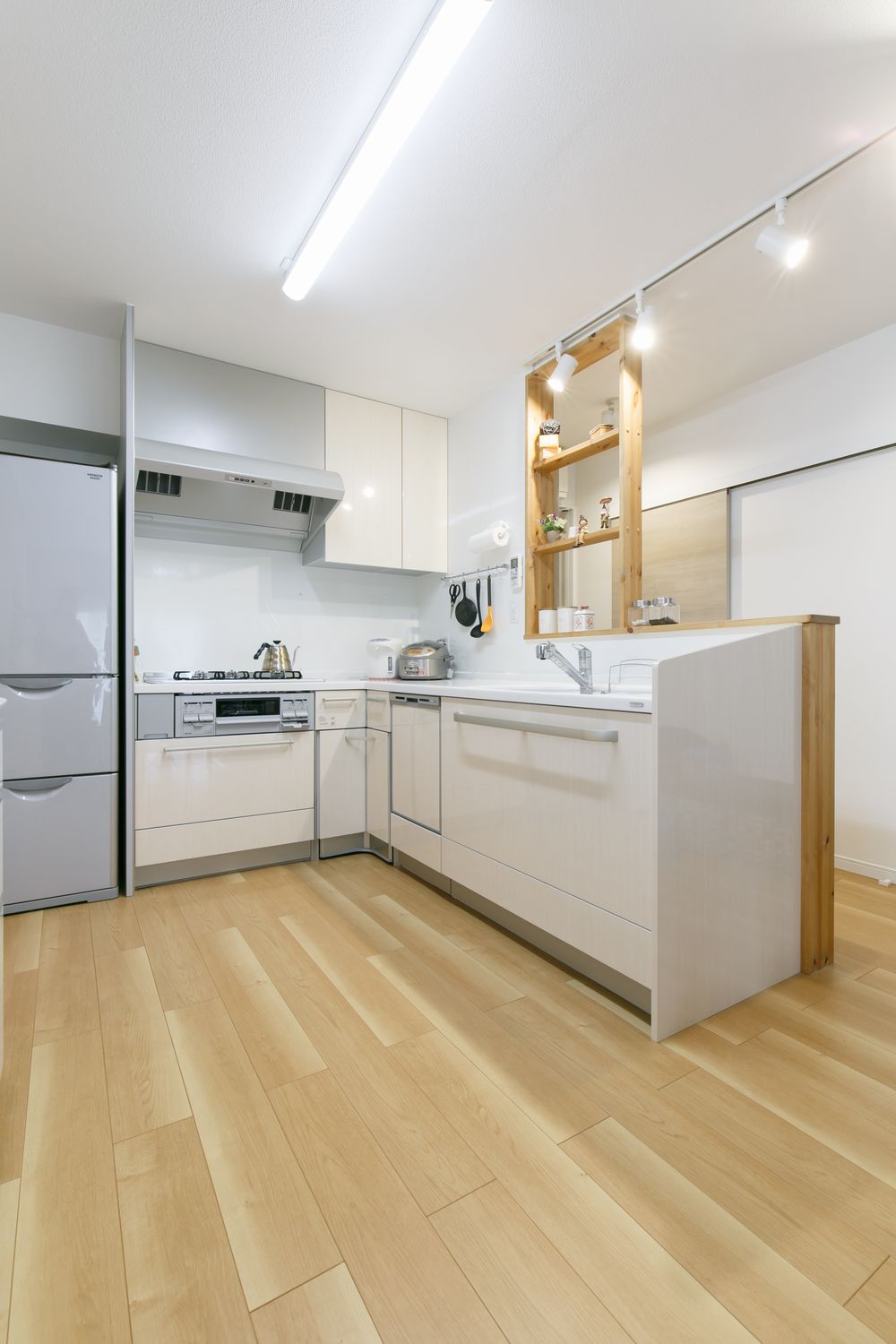 プランナーがご提案した様々なキッチンスタイルの中から、「L型キッチンにしたい!」と決められたS様。リビングダイニングへのアクセスも抜群です。作業しやすいL型キッチンですが、コーナー部分がデッドスペースになりやすいのが唯一のデメリット。でもこのキッチンなら、その心配はないようです。機能的なフロア収納、カウンターには使用頻度の高い家電を置くことができ、吊戸を手が届きやすい高さに設計。吊戸にはお子様の食器などが効率よく収まりました。そしてこのキッチンのフォーカルポイントは自然の木を使った棚。キッチン前の水まわり(洗面・浴室・トイレ)の入口の目隠しとなっています。お気に入りの小物や雑貨を飾れば、キッチンでの作業が一層楽しくなりますね。