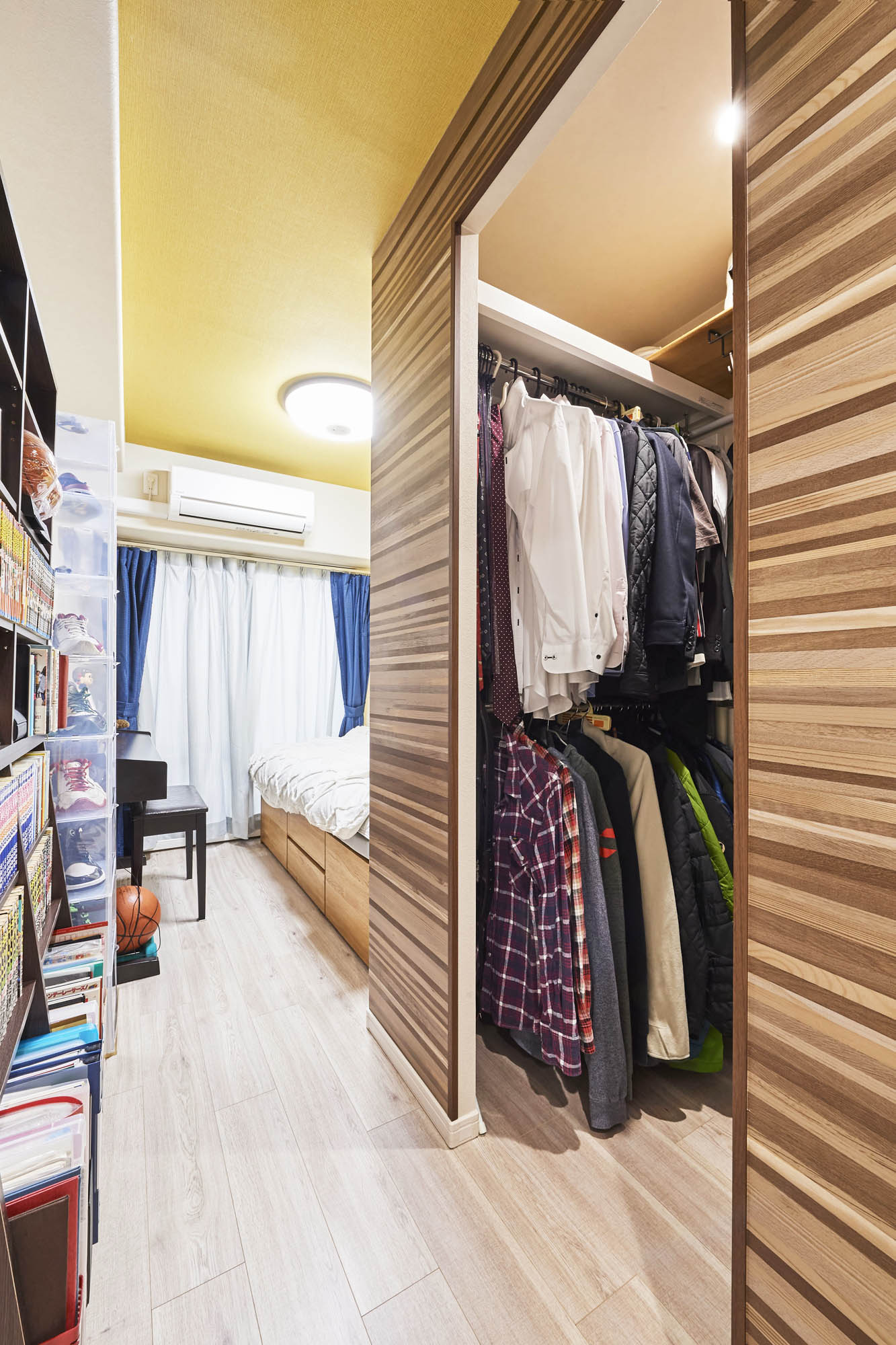 「スッキリとした空間で暮らす」がテーマのK様邸。各部屋にウォークインクローゼットを造作し、散らからないスッキリとした暮らしを実現。お部屋で過ごす一人の時間も快適になりました。ご主人のお部屋はからし色の壁紙に木目のアクセントクロスを合わせ、落ち着いた印象の中にも遊び心をプラスしました。