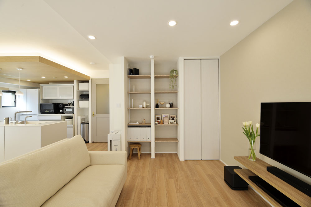 新しいリビングの一角には、見せる収納と隠す収納を上手く使い分けできるエリアを作り、和室からリビングに変化して一体感のあるLDKをスッキリとおしゃれに仕上げました。